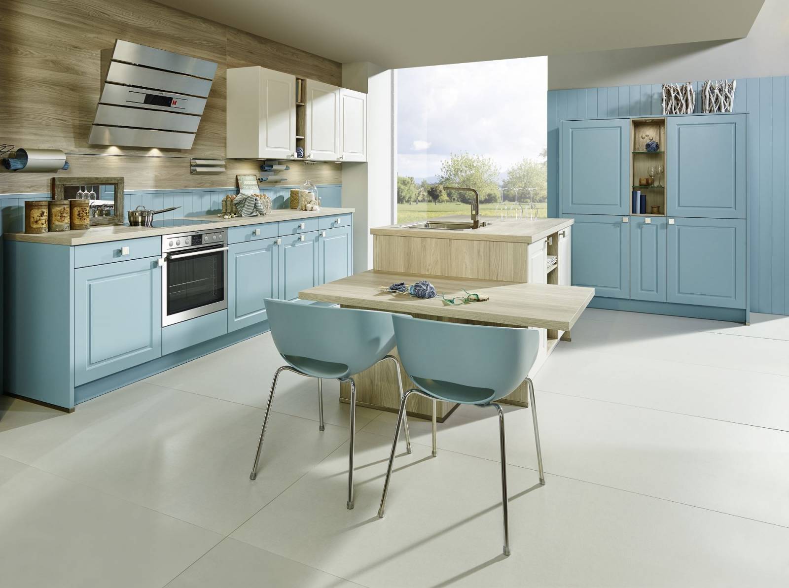 Un style cosy pour votre maison de vacances ou votre résidence en bord de mer.Avec ce modèle, la personnalisation des couleurs est sans limite. Ou presque !Déclinable dans presque 200 couleurs RAL et SIKKENS, vous déterminez le style de votre intérieur. C’est ici le coloris bleu pacifique qui vous ai présenté dans une finition de laque mate structurée.La couleur vient styliser la façade à cadre pour lui offrir un côté plus contemporain, permettant à ce modèle de s’intégrer dans plusieurs types d’habitations.L’intégration d’une hotte inclinée en inox et de niches ouvertes rétro-éclairées souligne l’aspect contemporain d’ores et déjà apporté et contraste avec l’aspect classique que suggère le modèle à cadre et les crédences en lambris.Point de vu aménagement, l’îlot central accueille un évier en inox ainsi qu’un coin repas pour deux personnes.La finition hêtre clair du plan de travail stratifié s’accorde tout aussi bien avec le coloris bleu pacifique du linéaire que du coloris magnolia de l’îlot central.Conseils de pro : jouez sur les poignées pour lui donner une touche plus ou moins classique. C’est la poignée qui sera l’élément déterminant dans le style que vous souhaitez insuffler à votre cuisine.