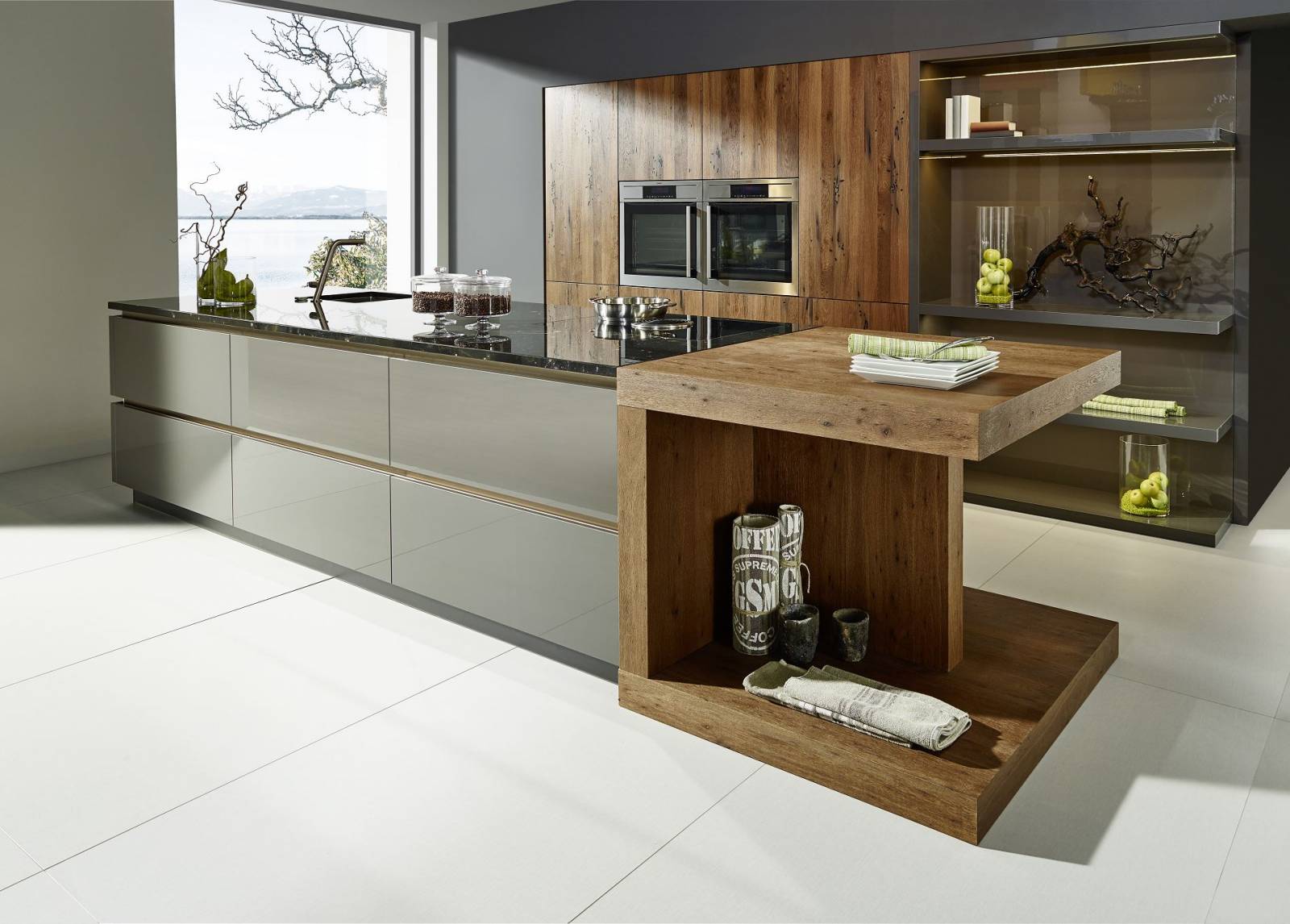 CUISILIGNE vous présente cette cuisine en laque gris ardoise brillante et son coin repas atypique plaqué chêne pour faire de votre cuisine un endroit unique. Avec ou sans poignée les grands casseroliers sont là pour optimiser votre rangement et faire de votre espace cuisine le lieux le plus ergonomique possible.Mise en valeur par le pan de mur d’armoires en placage chêne foncé, cette combinaison apporte à cette cuisine moderne laquée, toute la noblesse du bois. Le granit noir d’Angola en guise de plan de travail sur l’îlot vient quant à lui apporter son chic et son cachet. Cette installation vous procure tous les aspects les plus nobles des matériaux utilisés dans le cadre d’une cuisine aménagée : la laque, le bois ainsi que le granit.Les étagères « déco » également laquées viendront quant à elles, épurer le mur de fond et donner à cette cuisine un design incomparable.La Tania est déclinable en 7 coloris de laques brillantes et la Riva en 1 modèle standardisé puis 3 essences sur mesures.Conseils de pro : Entre les étagères, placez des miroirs gris argent pour gagner en profondeur et en luminosité.