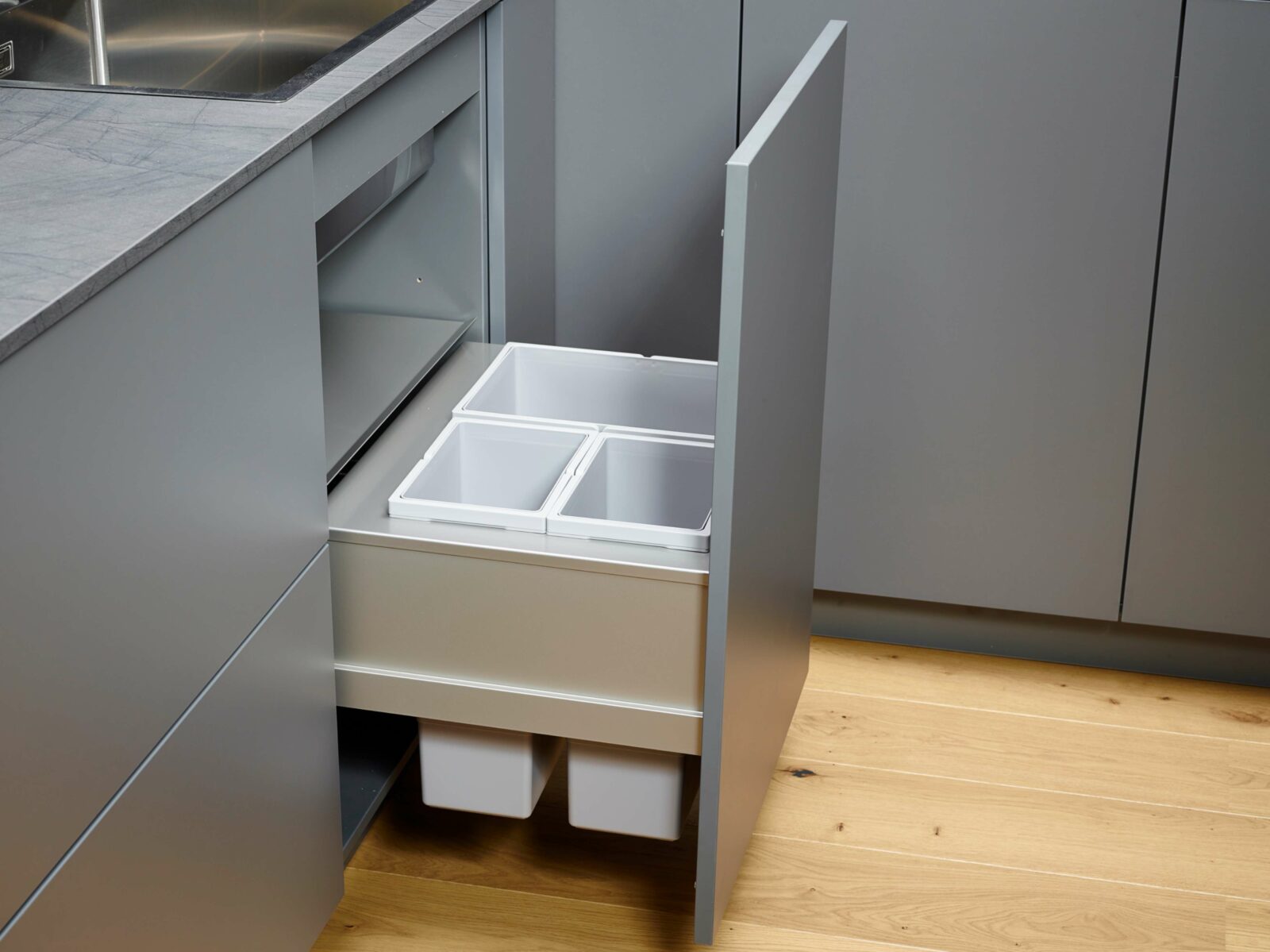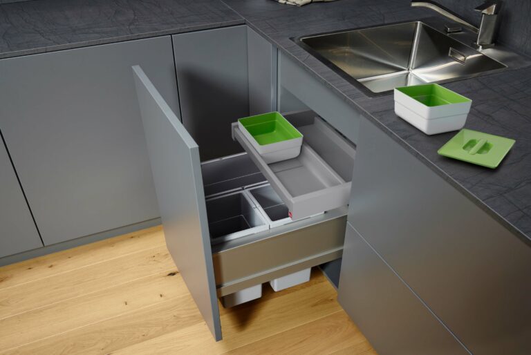 1. Sous l’évier : Installez des corbeilles de tri sous l’évier pour un accès facile et discret. Des tiroirs coulissants avec compartiments intégrés sont idéaux pour maximiser l’espace.