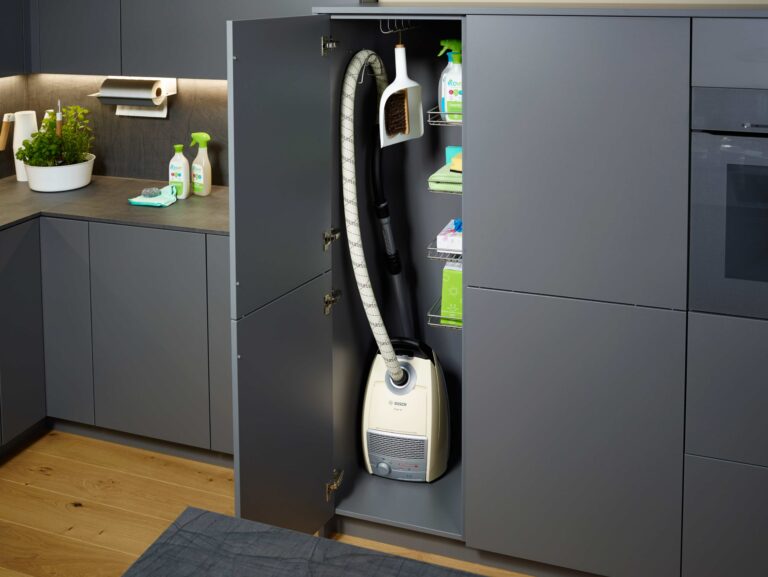 1. Placard pour aspirateur : Créez un espace spécifique pour votre aspirateur en installant un placard dédié. Aussi, assurez-vous qu’il est équipé de crochets pour ranger les accessoires et le cordon.