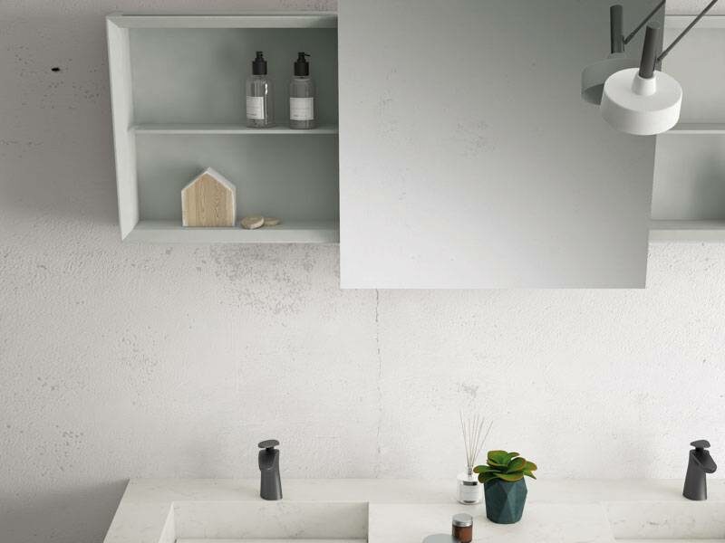 • Plan de toilette en marbre avec meubles en bois clair : Combinez un plan de toilette en marbre de Carrare poli avec des meubles suspendus en bois clair pour un effet aérien et moderne.