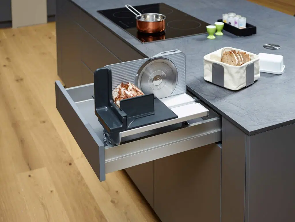 Tiroir rétractable : Encastrez la trancheuse dans un tiroir rétractable pour la ranger facilement lorsqu’elle n’est pas utilisée, tout en la gardant à portée de main.