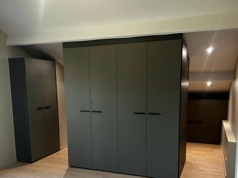 Cette réalisation illustre l’agencement d’un espace sous combles à Bordeaux grâce à des rangements et un dressing sur mesure. L’aménagement a été pensé pour tirer parti de chaque mètre carré, en s’adaptant parfaitement aux contraintes de la pièce mansardée. Les placards muraux aux façades mates et aux lignes sobres offrent une grande capacité de rangement tout en apportant une touche moderne et élégante. Leur conception sur mesure permet de s’intégrer harmonieusement dans les volumes atypiques de la pièce, notamment les pentes et les espaces réduits.
